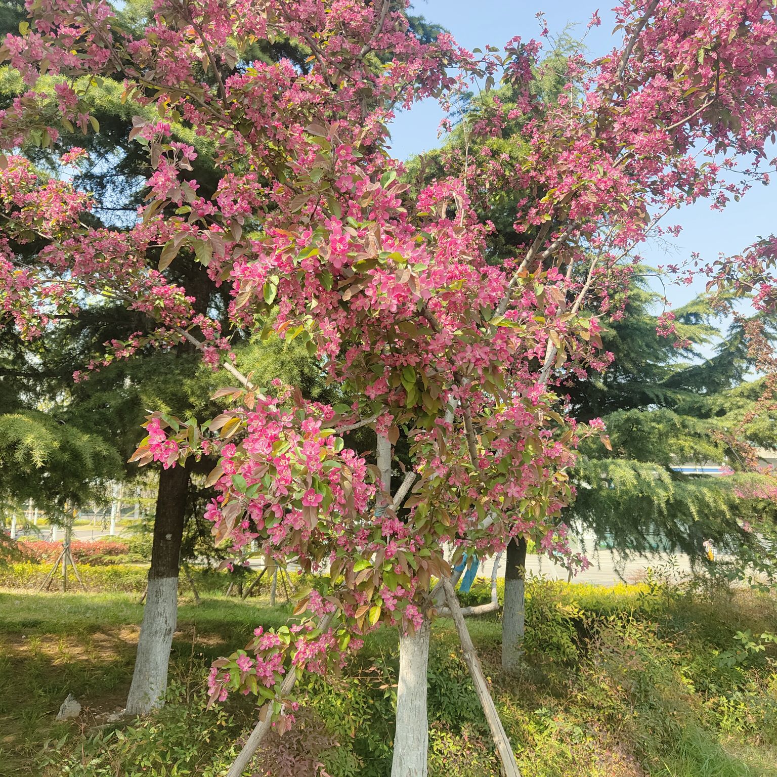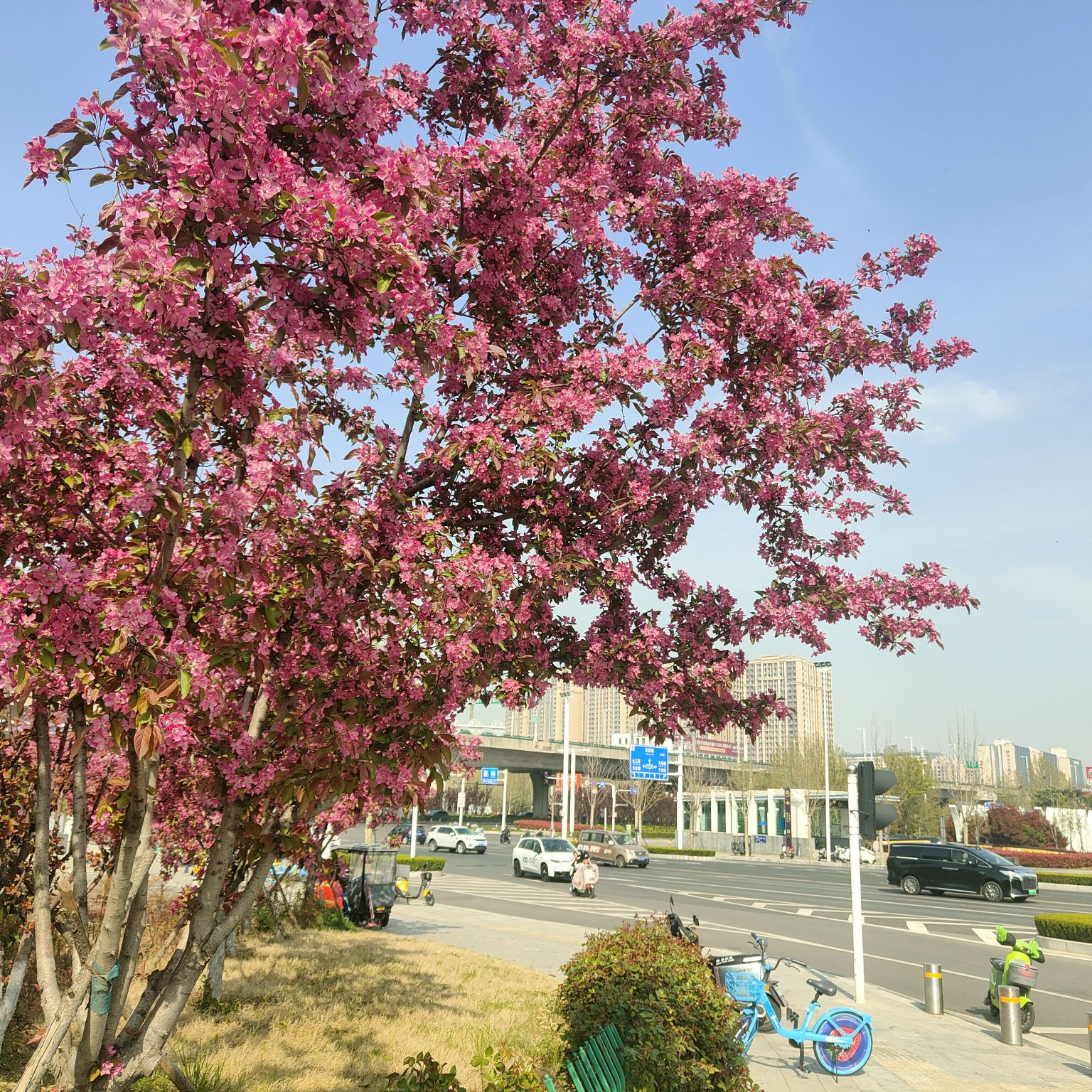 这是一棵长在路边的海棠,它的邻居不是名贵的花木,而是红绿灯、隔离栏,是来来往往的汽车与电动车,是行色匆匆的路人。它见过清晨通勤的匆忙,听过傍晚归家的疲惫,见过外卖骑手飞驰而过的身影,听过孩童嬉笑打闹的声音。它在喧嚣里扎根,在尾气中生长,却从未辜负每一个春天。当城市被钢筋水泥包裹,当生活被快节奏裹挟,这一树繁花,便成了喧嚣里的一处静谧,匆忙里的一份从容,给每一个路过的人,递上一份不期而遇的温柔。