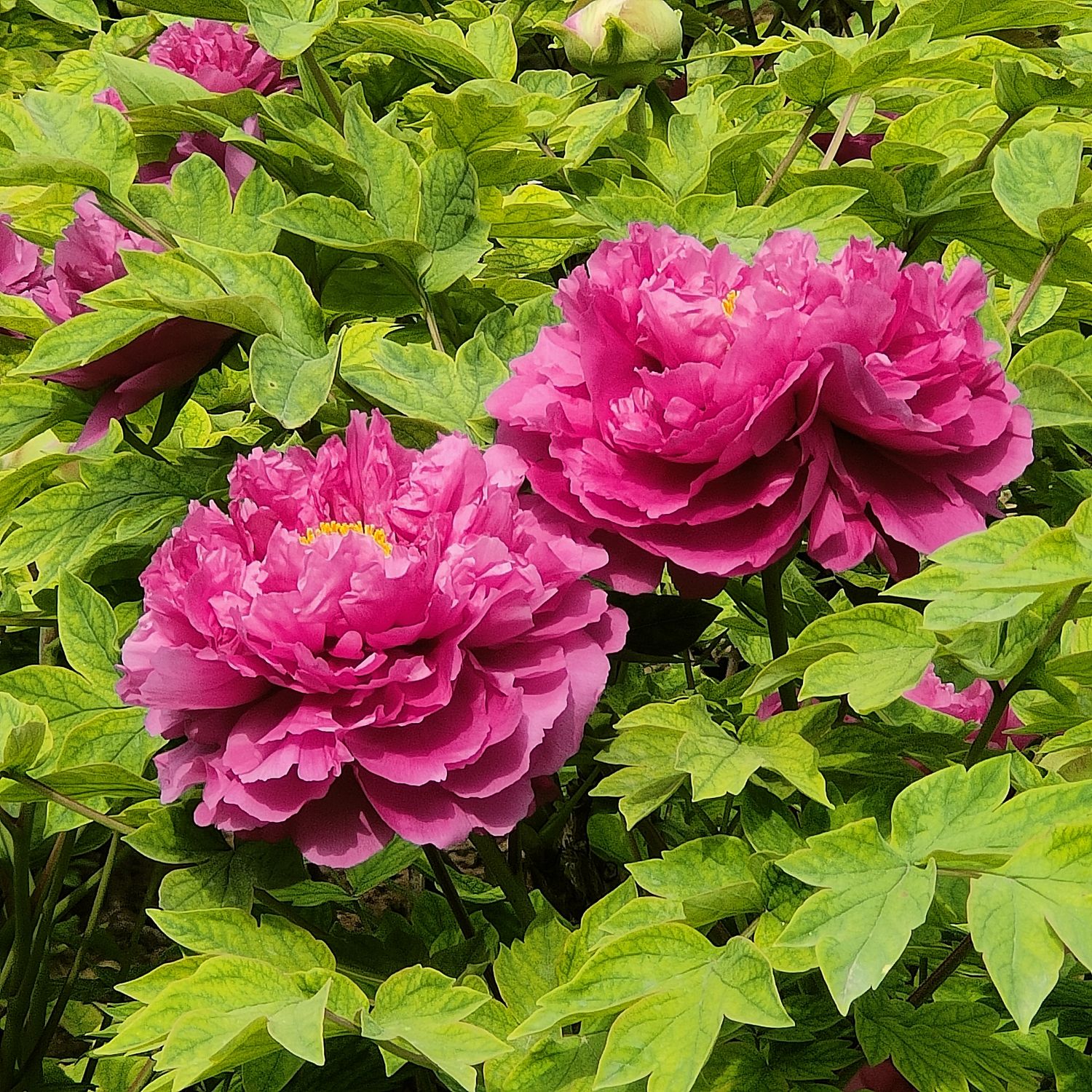 洛阳牡丹,以万千花色绘就四月天光,每一种都藏着独有的风华。霓虹焕彩以洋红台阁之姿,似霞光凝瓣,层叠间藏着墨紫细斑的雅致;春红娇艳如火燃枝头,蔷薇型的花瓣舒展着蓬勃生机,直上的花姿尽显昂扬;桃红飞翠以深粉为底,千层台阁的瓣型裹挟着绿意,雌蕊瓣化的绿彩为其添了几分清逸。朱砂垒浅红荷瓣,花瓣圆整,基部紫晕如朱砂点染,是传统名品中的温润之选;二乔更显奇绝,一株之上粉紫相间,半红半白,堪称花中奇葩,寓意阖家欢喜。香玉初开粉白、盛放洁白,皇冠型的花型硕大舒展,似月光轻覆花瓣;红宝石深洋红如宝石凝光,细腻质地衬得宝润光泽愈发耀眼;雏鹅黄以嫩黄为色,似雏鹅绒毛般柔软,在万红丛中添一抹清新。迎日红愈晒愈艳,红色千层台阁的花型迎着晨光舒展,墨紫斑为其添了几分厚重;乌金耀辉墨紫近黑,冷艳质感中藏着华贵气场,是稀有的深色牡丹;洛阳红以纯正紫红闻名,蔷薇型花姿挺拔,是洛阳栽植最广的传统品种;银红巧对粉红花色配菊花型瓣,质硬耐晒,单花期长,是赏花与切花的佳品;白雪塔则以纯白胜,塔状重瓣层层叠叠,宛如积雪堆积,清雅又端庄。红、白、粉、黄、紫、复色诸色齐聚,台阁、荷花、皇冠、蔷薇诸型争艳,风采万千,将四月的洛阳染成花的海洋。